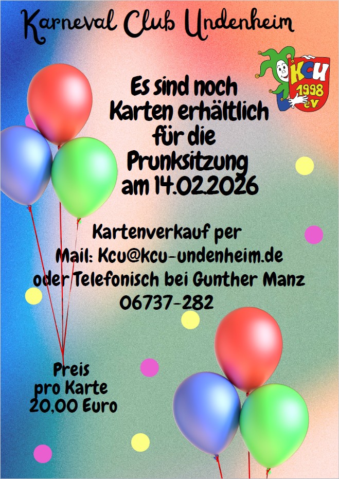 Am 14.02.2026 findet ab 18:33 Uhr die Prunksitzung des KCU statt. Der Kartenvorverkauf findet am 10.01.2026 ab 10:11 Uhr statt. Damit die Käufer nicht zu lange im Kalten stehen müssen, wird die Hallentür um 08:00 Uhr geöffnet und es werden Nummern für die Käufer vergeben. Pro Käufer werden max. 10 Karten ausgegeben.