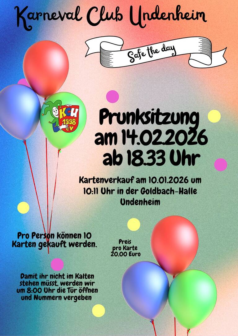 Am 14.02.2026 findet ab 18:33 Uhr die Prunksitzung des KCU statt. Es gibt noch Karten für die Prunksitzung, Interessenten bitte per Email an kcu@kcu-undenheim wenden.